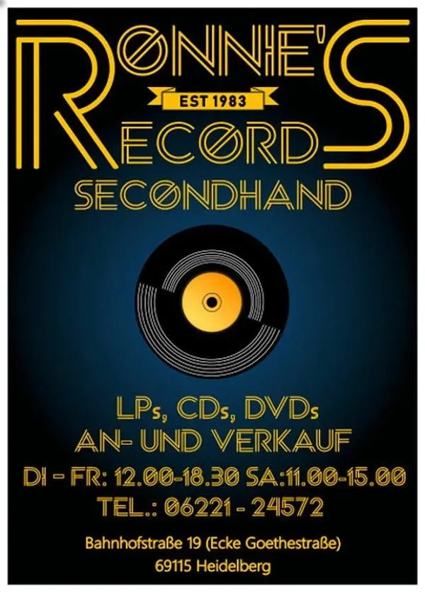- Secondhand Schallplatten/Vinyl und CDs in Heidelberg-Weststadt, Bahnhofstr.19/ Ecke GoethestrAn- und Verkauf von gebrauchten LPs, CDs, DVDsRock, Pop, Jazz, Klassik, Heavy, Reggae, Blues und SoulGründungsdatum 1983Öffentliche VerkehrsmittelStraßenbahn- und Bushaltestelle Seegarten